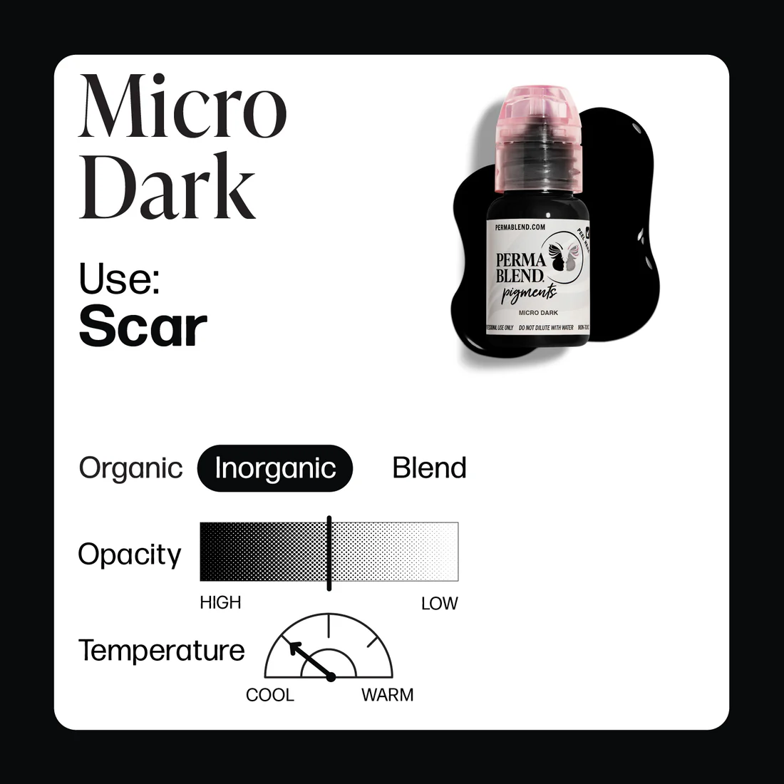 - میکرودارک رنگی مشکی بسیار تیره و خنثی است که برای ایجاد خطوط دقیق و نمایی پررنگتر و برجستهتر استفاده میشود و بیشتر مناسب افرادی است که به دنبال رنگهای کاملاً مشکی یا موهای بسیار تیره هستند.