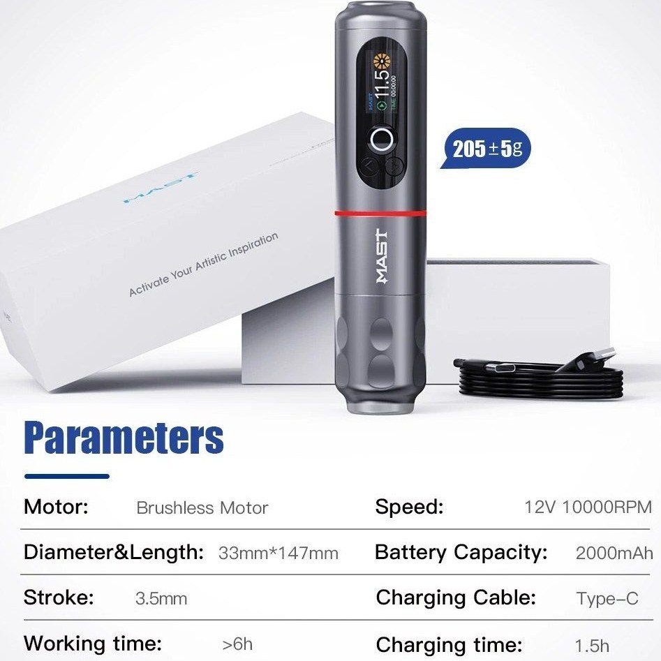 دستگاه تتو Mast Archer 2 یک ماشین روتاری حرفهای بیسیم است که برای هنرمندان تتو و آرایش دائم طراحی شده است. این دستگاه با موتور براشلس قدرتمند و سیستم انتقال دندهای پیشرفته، عملکردی دقیق و بیصدا را ارائه میدهد. طول استروک ثابت ۳.۵ میلیمتر آن برای انواع تکنیکهای خطکشی و سایهزنی مناسب است. ولتاژ کاری آن بین ۵ تا ۱۲ ولت متغیر است و سرعت موتور آن بین ۸۷۵۰ تا ۱۰۵۰۰ دور در دقیقه میباشد. باتری لیتیومی ۲۰۰۰ میلیآمپری آن پس از ۲ ساعت شارژ کامل، حدود ۸ ساعت زمان کار را فراهم میکند. این دستگاه با طراحی ارگونومیک و وزن سبک ۱۸۶ گرم، استفاده طولانیمدت را راحت میسازد. همچنین، دارای صفحه نمایش LCD برای نمایش ولتاژ و زمان کار است و از طریق پورت USB-C شارژ میشود. این دستگاه با اکثر سوزنهای کارتریجی استاندارد سازگار است و انتخابی ایدهآل برای هنرمندان تتو و آرایش دائم محسوب میشود.