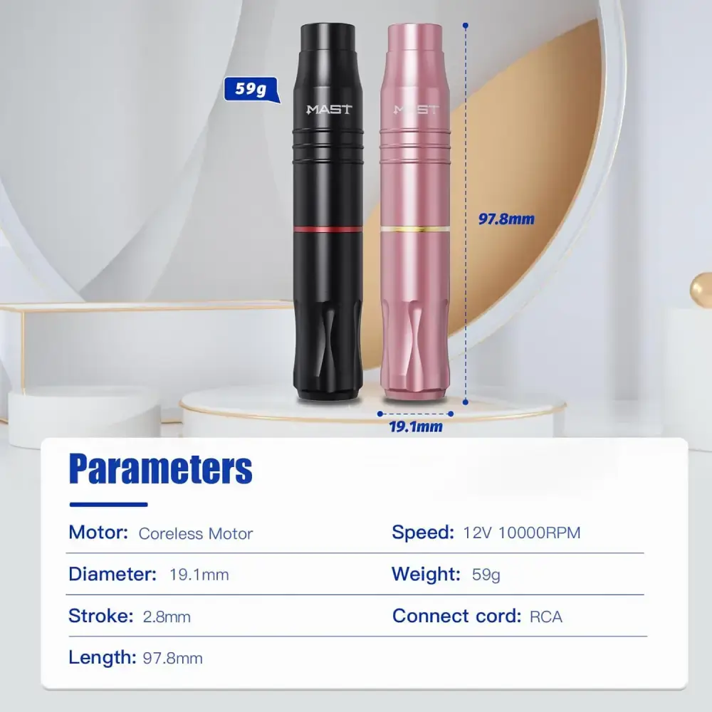 دستگاه تتو Mast Tour 2 یک ماشین روتاری حرفهای و بیسیم است که برای هنرمندان تتو و آرایش دائم طراحی شده است. این دستگاه با طراحی ارگونومیک و وزن سبک ۵۹ گرم، استفاده طولانیمدت را راحت میسازد. موتور کورلس پیشرفته آن عملکردی بیصدا و دقیق را ارائه میدهد و با سرعت ۱۰۰۰۰ دور در دقیقه، قدرت مناسبی برای انجام انواع تکنیکهای تتو فراهم میکند. طول استروک ۲.۸ میلیمتر آن برای طراحی خطوط دقیق و سایهزنی مناسب است. ولتاژ کاری آن بین ۴ تا ۱۲ ولت متغیر است و از طریق اتصال RCA به منبع تغذیه متصل میشود. این دستگاه با اکثر سوزنهای کارتریجی استاندارد سازگار است و برای انواع سبکهای تتو و آرایش دائم مناسب میباشد.